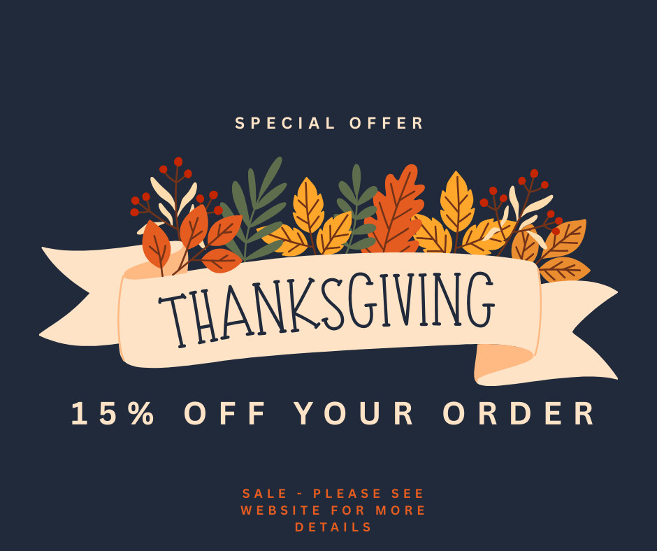 During this Thanksgiving holiday week, enjoy 15% off your entire order. If you are interested in any *PRE-ORDER* items, please ensure that they are placed on a separate order.