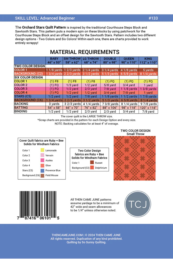 The Orchard Stars quilt pattern by Then Came June is inspired by the traditional courthouse steps block and sawtooth stars. This pattern has the instrucctions for 6 different sizes and 2 different color inspirations. Fabrics shown on the cover are from the Ruby + Bee collection from Windham by Heather Ross and Annabel Wrigley.